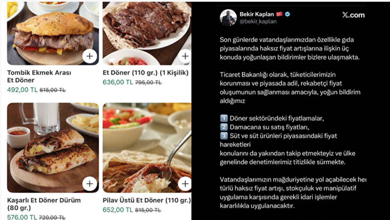 “Ticaret Bakanlığı olarak, tüketicilerimizin korunması ve piyasada adil, rekabetçi fiyat oluşumunun sağlanması amacıyla, yoğun bildirim aldığımız Döner sektöründeki fiyatlamalar, Damacana su satış fiyatları, Süt ve süt ürünleri piyasasındaki fiyat hareketleri. Konularını da yakından takip etmekteyiz ve ülke genelinde denetimlerimiz titizlikle sürmekte.